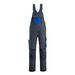 Tweekleurig. Lichtgewicht materiaal. Drievoudig gestikte naden aan de broekspijpen en in het kruis. Verstelbare schouderbanden met korte sterke elastieken en kunststof gespen. Borstzak met klep, pennenzakje, telefoonzakje en verborgen drukknopen. ...